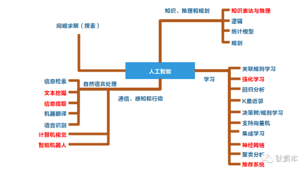 下图中画红线的部分是近期和投资有关的领域,包括文本识别、信息提取、语音识别、计算机视觉、机器人智能,深度学习和神经网络的学习、知识表达推理、知识图谱等,这些看起来量很大,但是实际上与投资有关的并不多。
