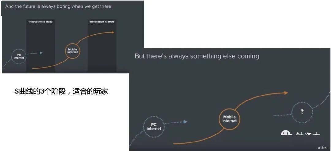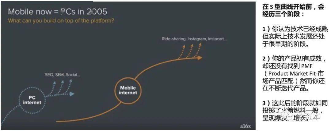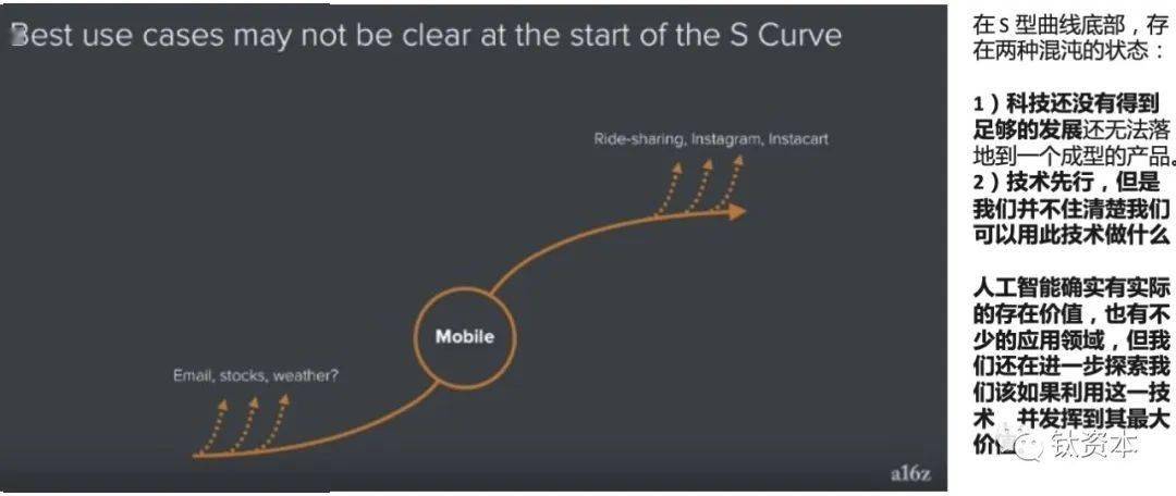 当到达某一个时间点以后会促成产业、技术和应用的结合,就是S的竖线,在这个时间点会出现很多创新的机会,这是最适合风险投资的阶段;