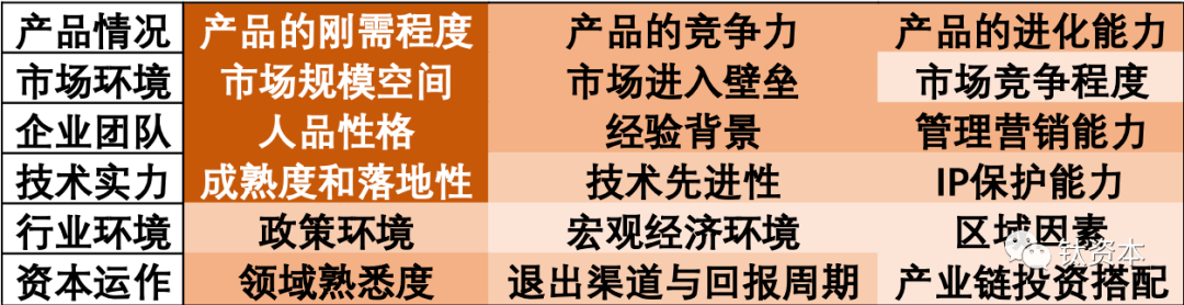再来谈投资要素,主要是产品、市场、企业、技术、行业和资本运作,下图中颜色越深的地方就越重要。