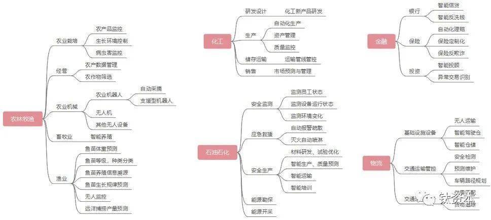 下图列举了AI在不同领域的应用。在工业领域有很多应用,比如生产排期、智能控制、设备维护、智能质检等等;在零售行业、酒店、智能电网、农林牧渔、化工、金融、石油石化、物流等很多领域也有很广泛的应用。
