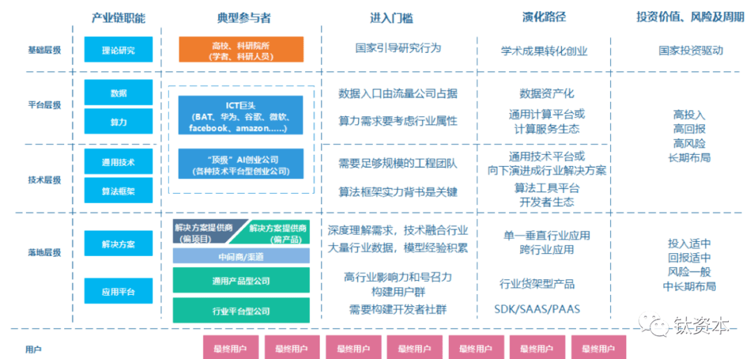 分析一下中国AI的不同层级:技术层就是理论研究,属于科研院的范畴;平台层有很多,往往是互联网和通信时代的巨头在运营,例如BAT、华为、谷歌、京东、亚马逊、Facebook,它们既有数据又有流量。