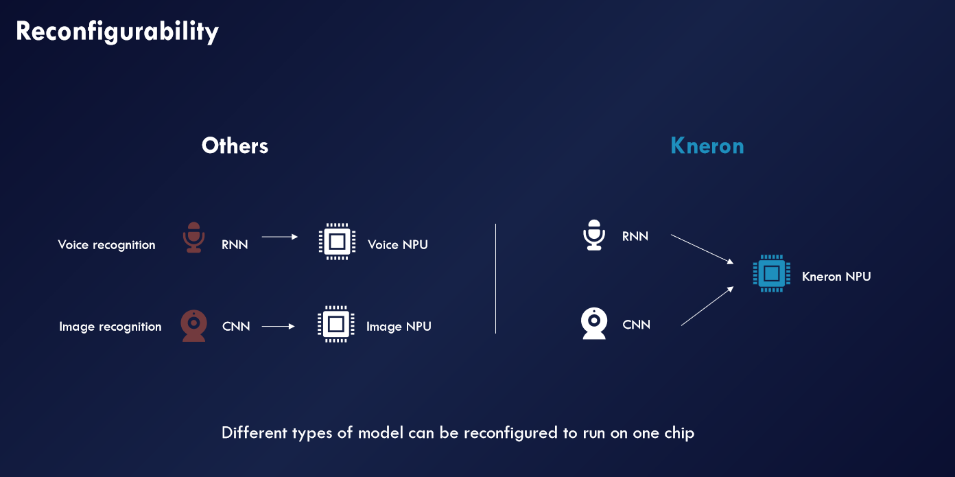 所谓的可重构人工神经网络,可以理解为这款芯片提供的是一堆乐高积木,当需要支持语音AI的模型时,就通过指令集进行组合;需要支持图像AI模型时,再重新组合,可以很好地支持多种神经网络模型,并且保持架构的精简性。