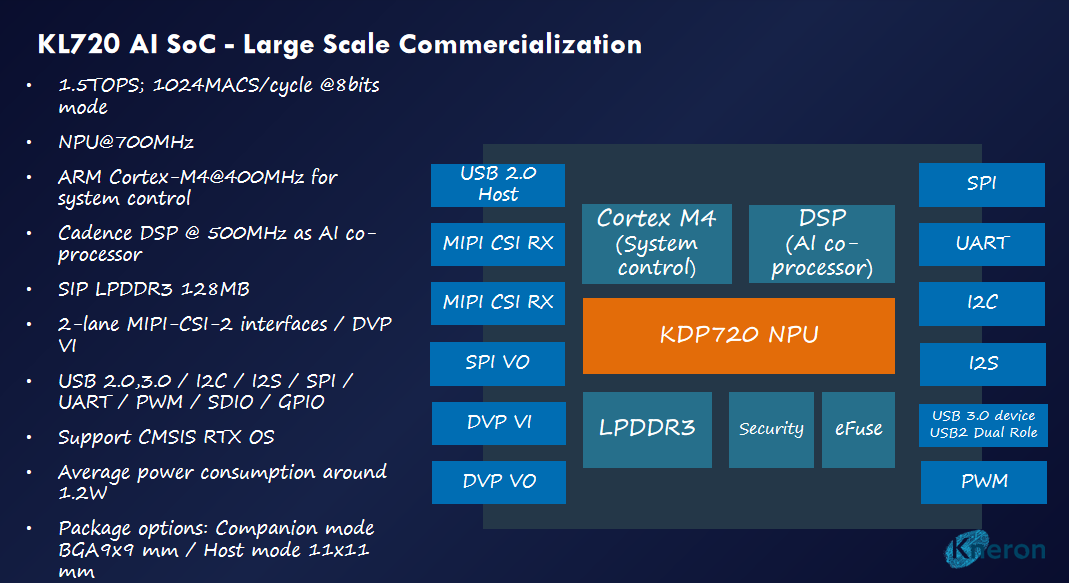 耐能KL720采用自主研发的KDP720系列NPU IP,内置ARM Cortex-M4 CPU、FPU与Cadence P6 DSP,算力最高可达1.5TOPS,并支持CNN与RNN。