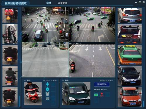 “睿智”服务器把实时视频进行结构化分析,将复杂场景中的人、机动车、非机动车分离,全方位提取车辆特征,如车型、车系、车身颜色、车牌颜色、车牌号码识别、主副驾驶是否系安全带、是否打电话、有无遮阳板、有无年检标、有无挂坠、有无纸巾盒;针对行人,“睿智”服务器可以多方面分析其相关特征,包括性别、表情、年龄段、服饰特征(上下衣着颜色、眼镜)、携带物特征(背包、打伞)、运动特征等。