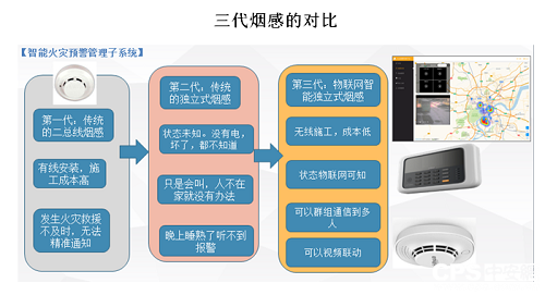 相对于传统烟感,整套系统的特点更加突出:快速精准识别火情、24小时自动值守、终端手机复合报警、无线联网简易安装四个方面。