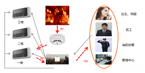 烟感感应到烟雾到报警需要2秒的时间。烟感用1秒钟时间通过无线信号将报警信号传输给楼层的主机终端。