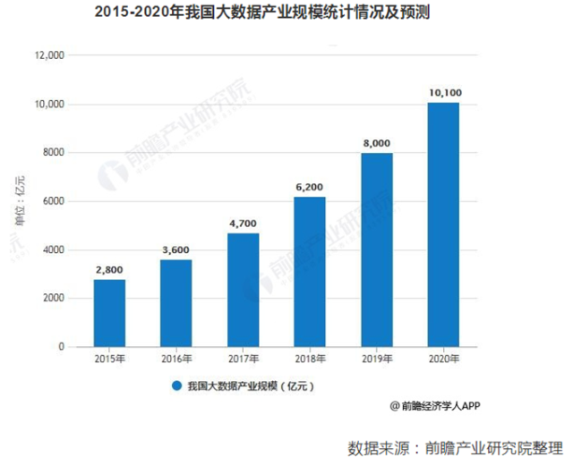 据前瞻产业研究院发布的《中国大数据产业发展前景与投资战略规划分析报告》统计数据显示,2015年我国大数据产业规模已达2800亿元。截止至2017年我国大数据产业规模增长至4700亿,同比增长是30.6%。初步测算2018年我国大数据产业规模达到5400亿元左右,同比增长15%。预测在2020年我国大数据产业规模将突破万亿元。