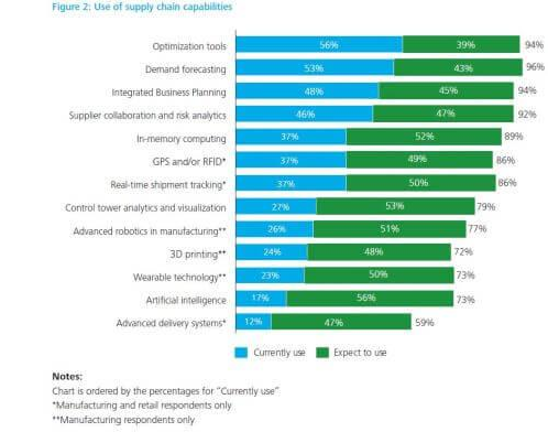 在下面的图表中,德勤的一项研究显示了目前正在使用大数据的供应链公司的使用情况,以及它们在未来的预期使用情况。