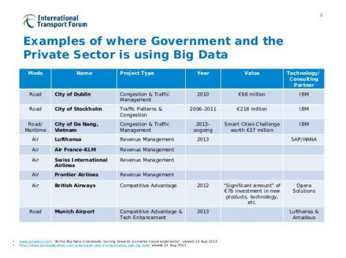 私营部门可以在运输领域使用大数据:收入管理、技术改进、物流和竞争优势(通过合并发货和优化货运流动)。