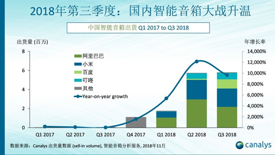 从研究机构Canalys公布的数据来看,阿里巴巴的智能音箱在2018年Q1、Q2、Q3的出货量分别达到110万、279万以及220万。如果Q4考虑“双11”、“双12”的带动,保守估计Q4的出货量也在200万台以上。也就是说,从发布到现在,阿里巴巴用了一年半的时间把自家的智能音箱用户数提升至千万级以上。