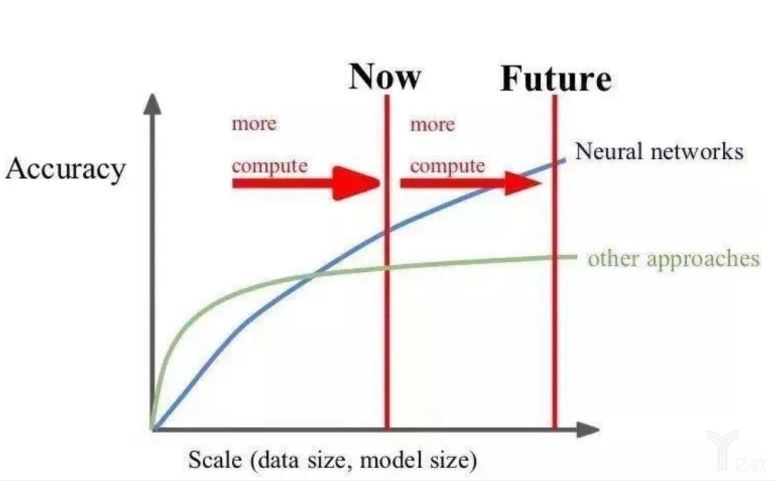 以上横轴为数据量,纵轴为准确率,蓝色以及绿色线条分别代表深度学习以及传统算法。根据Jeff Dean的预判,随着数据规模的不断扩大,未来深度学习算法的精度也将不断提升。