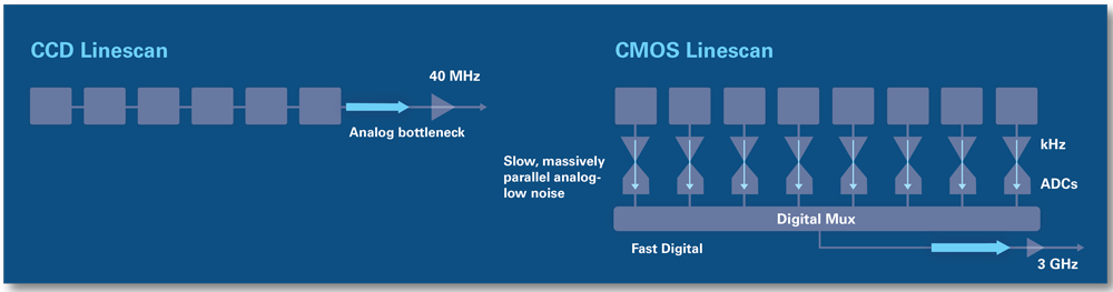 在CMOS中,数据路径的前端高度并行。这允许每个放大器具有低带宽。相反,高速CCD具有一定量的并行的输出通道,但不如高速CMOS那样拥有大量并行模拟前端,可以进行大规模并行处理。