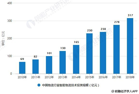 近年来,中国智能物流投资总体规模不断扩大,中国物流行业基础信息化建设已经进入一个相对稳定的状态,物流企业开始重视业务流程管理、客户资源管理、全程物流服务和供应链管理为基础的一体化服务等方面的投入,作为提升自身核心竞争力的重要手段。2018年全国物流行业智能物流技术投资规模达到317亿元左右。
