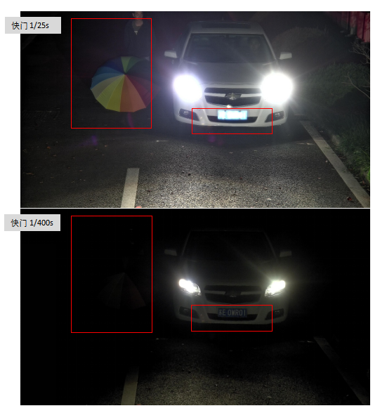 而一般普通视频监控摄像机夜间的工作快门是1/25s,人员卡口的快门1/100s,车辆卡口的快门就要更快1/400s。这些专业应用的摄像机上提升的快门速度,把大光圈镜头带来的亮度提升又抵消掉了,导致目标物体周围的场景一片漆黑,丢失了非常多的有效信息。