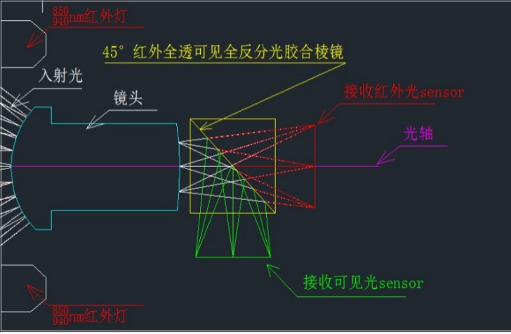 第二种方案是黑光相机。黑光技术主要是采用两颗星光级图像传感器,通过特殊的光学元器件,其中一颗传感器通过红外补光采集图像亮度信息和物体轮廓,另外一颗采集色彩信息。然后通过图像融合算法将两颗采集到的图像信息进行融合,输出既明亮,又是彩色的图像。