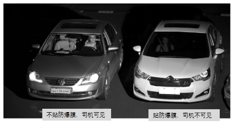在交通卡口的应用中,由于汽车前挡风玻璃上粘贴的防爆膜红外透光率很差。所以采用黑光技术和红外爆闪灯的环保卡口,如图所示并不能采集到前排司乘人员的图像信息。