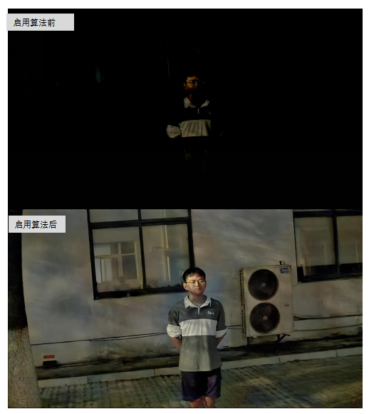 在低照情况下,该算法模型跳过了传统摄像机的ISP成像调制方式,通过对大量场景抓拍图片的学习,算法直接对传感器输入数据进行图像恢复,可以大幅减少摄像机对补光灯的依赖,在提升图像亮度的同时,还能充分还原物体颜色与纹理等细节信息。
