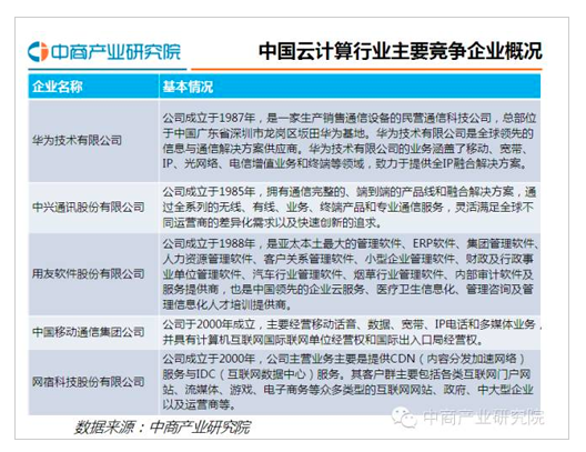 目前,我国云计算行业主要竞争企业有华为技术有限公司、中兴通讯股份有限公司、用友软件股份有限公司、中国移动通信集团公司、网宿科技股份有限公司。